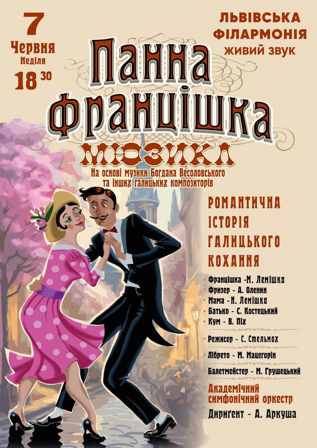 В неділю 7 червня 2026 року Львівська Національна філармонія імені Мирослава Скорика запрошує до себе глядачів на феєричний мюзикл «ПАННА ФРАНЦІШКА» - це романтична та водночас драматична історія галицького кохання, в основу якого лягла музика Богдана Весоловського та інших галицьких композиторів. Мюзикл отримав спеціальний приз від Європейського фонду культури.