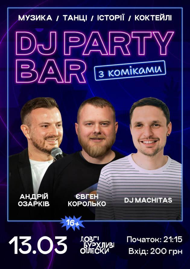 PARTY BAR - новий формат в улюблених Довгих Бурхливих Оплесках! Шоу, де переплітаються всі стихії. На вас чекають історії від коміків, смачні коктейлі та драйвовий діджей сет!