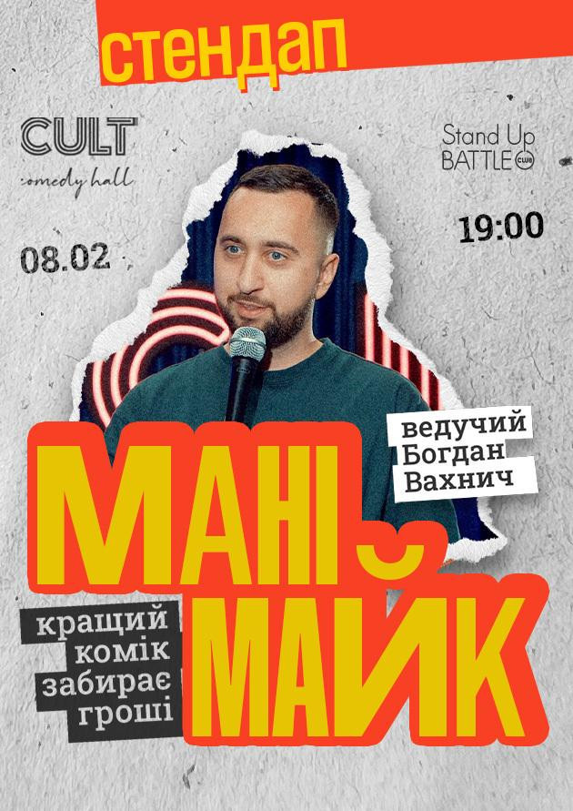 МАНІМАЙК - це коли досвідчені коміки змагаються своїми жартами за грошовий приз. Глядачі обирають найсмішнішого, тому весело буде всім - і глядачам, і самим комікам