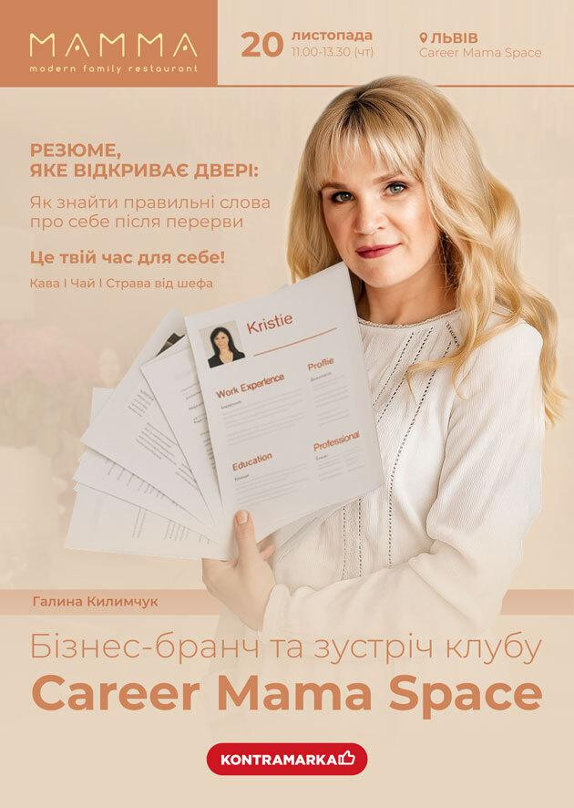 Запрошуємо на бізнес-бранч клубу Career Mama Space у затишному ресторані MAMMA modern family restaurant, щоб разом: дізнатися, як перетворити материнські та побутові навички у професійні переваги навчитися впевнено говорити про себе після перерви створити резюме, яке відкриє двері до співбесід і нових можливостей знайти натхнення для нового етапу життя — без страху і сумнівів