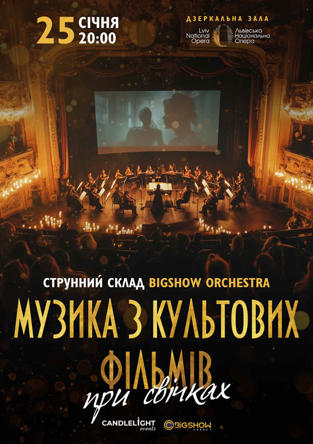 У дзеркальній залі Львівської опери відбудеться подія, яка об’єднає музику, світло і магію кіно. Струнний склад BIGSHOW orchestra перенесе вас у світ саундтреків з легендарних фільмів, які залишили слід у серцях мільйонів.