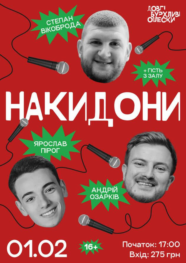 Шоу "Накидони" - імпровізаційний формат, в якому коміки знайомляться з глядачами, обговорюють новини і роблять свої заготовки смішнішими! Глядачі можуть розповідати історії на сцені і весело проводити вечір в теплій атмосфері!