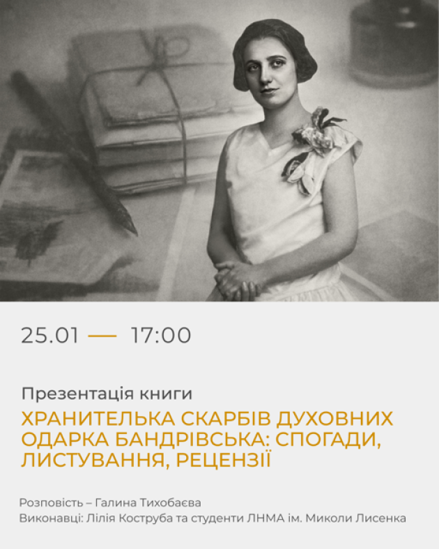 Запрошуємо на презентацію книги "Хранителька скарбів духовних. Одарка Бандрівська: спогади, листування, рецензії". Це видання базоване на матеріалах фондової збірки музею Соломії Крушельницької і є результатом багаторічної пошукової й дослідницької роботи музейних працівників.