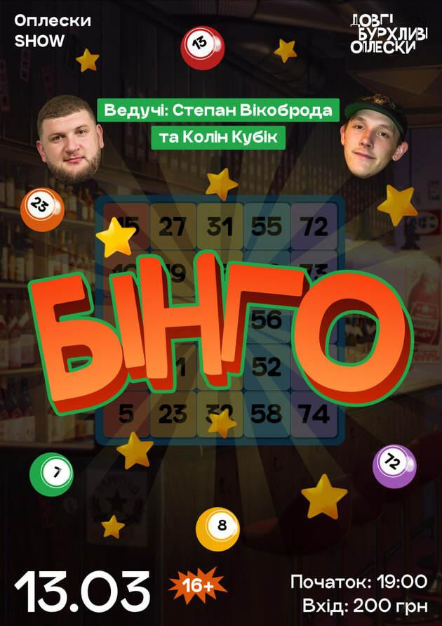 А Бінго у Довгих Бурхливих Оплесках - це чудове поєднання азарту й гумору, адже ведучими вечора будуть стендап-коміки Степан Вікоброда та Колін Кубік!