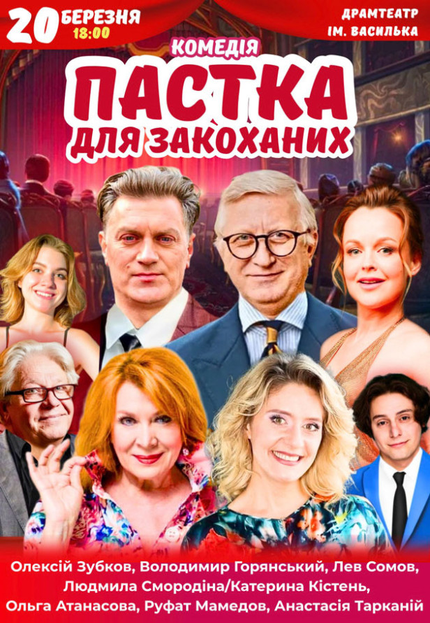 На численні прохання глядачів! Чудова комедійна вистава «Пастка для закоханих» знову у Львові! 16 квітня, палац культури «Рокс», початок о 19:00 Без чого освідчена людина на землі не може жити?… Без чого кожен з нас почуватиметься нещасним у власному житті? Звичайно, це - любов. Щиро закохані люди нічого поруч з собою не помічають… Але сама думка, що можна втратити кохану людину, змушує героїв нашої комедії вчиняти дивні, іноді, навіть - божевільні вчинки. А якщо додати, що в цій історії кохання енергійно «допомагає» детектив- аматор, жінка, до того ж - письменниця кримінальних романів, яка натхненно веде слідство зради, яке стане змістом її неперевершеного літературного творіння, історія перетворюється на життєвий каламбур з великою кількістю непередбачуваних подій. Це блискуча, віртуозна класична комедія положень з присмаком іспанської запальності та темпераментом у виконанні зірок українського театрального мистецтва. На сцені: - Володимир Горянський - Катерина Кістень/Людмила Смородіна - Олексій Зубков - Лев Сомов - Ольга Атанасова - Руфат Мамедов/Станіслав Єжов - Анастасія Тарканій Ця зустріч буде сповнена щирим сміхом, посмішками і неймовірно світлим настроєм. Вистава стане для вас ковтком свіжого повітря, прохолодної води, невеликим приємним відпочинком у ці непрості часи нашої долі. Щиро та з нетерпінням чекаємо вас на нашій виставі.