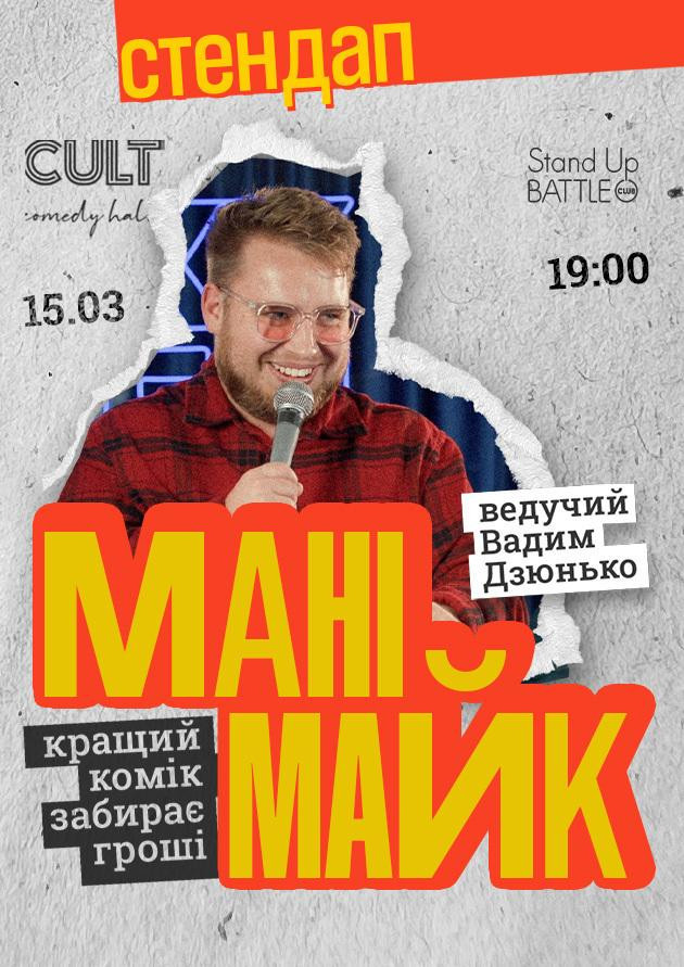 МаніМайк — це вечір, де коміки виходять на сцену з свіжим та перевіреним матеріалом, розкачують зал і змагаються за звання «коміка тижня». Тут усе по-справжньому: лише жива енергія та щирий, гучний сміх