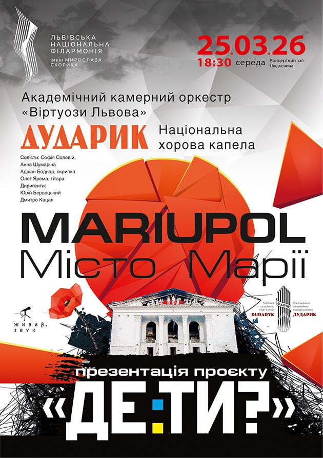 25 березня 2026 року у Львівській національній філармонії імені Мирослава Скорика відбудеться концерт-реквієм «MARIUPOL. Місто Марії» — презентація благодійного культурного проєкту ініційованого Ucrainica Research Institute «ДЕ ТИ: Where are you?».