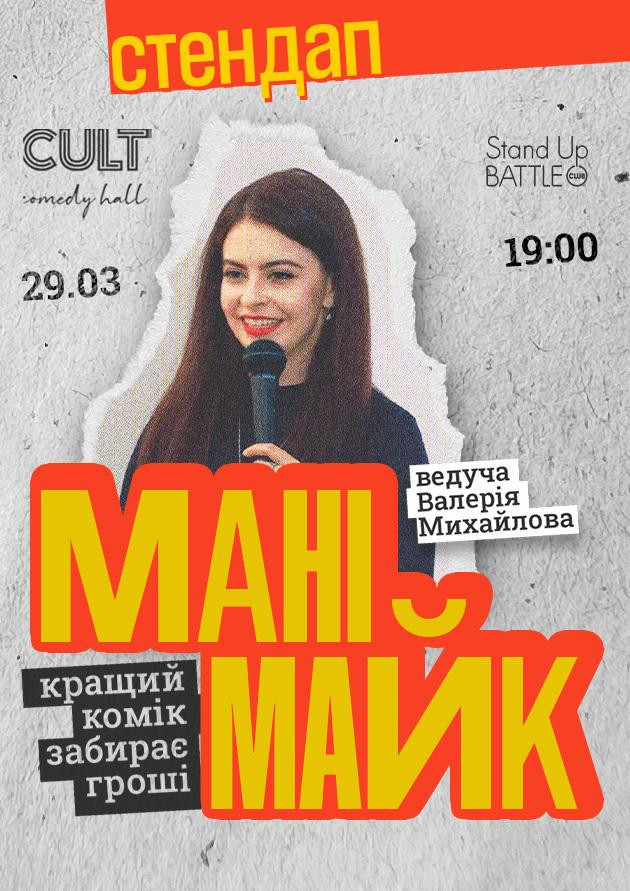 МАНІМАЙК — це вечір, де досвідчені коміки змагаються своїми жартами за грошовий приз, а глядачі обирають найсмішнішого. Весело буде всім — і залу, і самим комікам