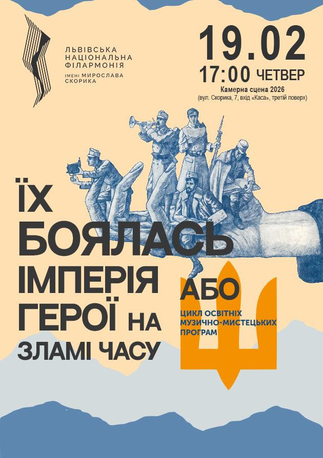 Продовжуємо у Львівській національній філармонії імені Мирослава Скорика цикл програм про героїв, яких боялась імперія, яких зумисно стирали з пам’яті і яких до тепер вбиває і нищить наш ворог. У кожній програмі будуть розповіді про наших українських героїв від часів першої світової війни і до сьогодні, а також у виконанні солістів Львівської національної філармонії звучатимуть музичні твори та поезія, які супроводжували наших героїв у різні часи боротьби за українську незалежність аж до воєнного сьогодення.