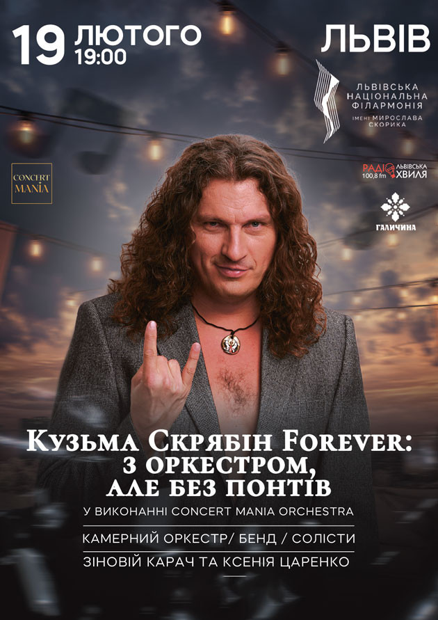 19 февраля 2026 года во Львовской национальной филармонии состоится концерт “Кузьма Скрябін Forever: з оркестром, але без понтів”.