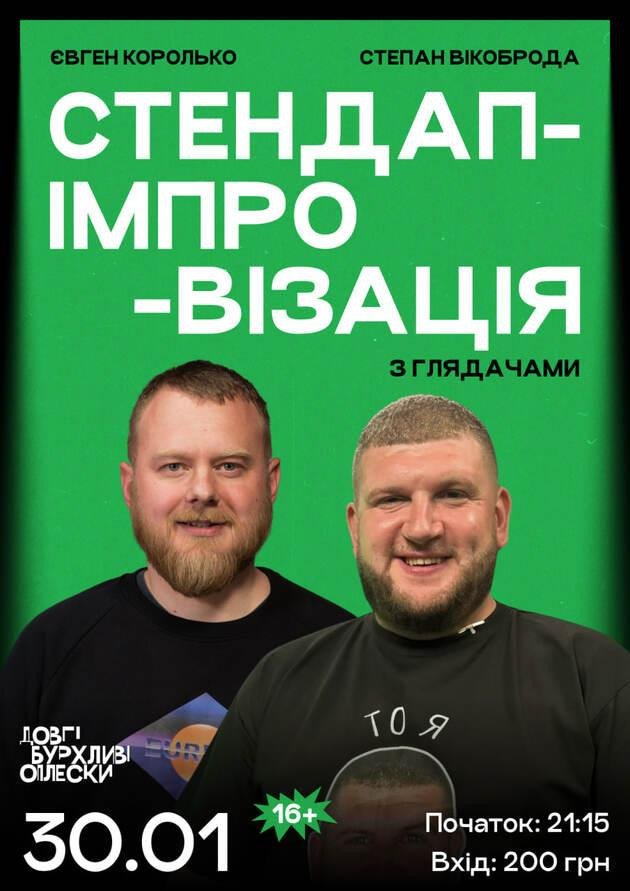 Стендап-імпровізація з Євгеном Корольком та Степаном Вікобродою — це вечір без заготовок і домашніх жартів. Усе, що відбувається на сцені, народжується тут і зараз: теми підкидає зал, коміки реагують миттєво, а кожна хвилина може піти в абсолютно несподіваний бік. Це не просто шоу, а жива розмова з вами.