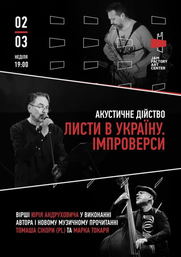Запрошуємо на акустичне дійство від Юрія Андруховича, Томаша Сікори та Марка Токаря “Листи в Україну. Імпроверси”!