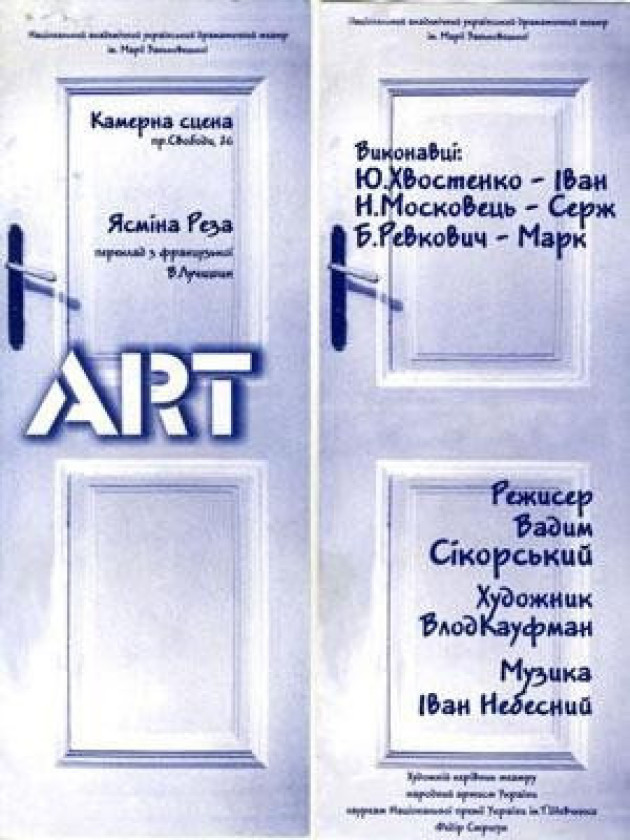 «У світі сучасної людини незліченна кількість проблем, турбот, та непорозумінь. Що вже говорити про суперечки, які неначе очікують та підстерігають нас щомиті. Проте талановито сперечатися також треба вміти. Не вірите? Тоді перегляньте виставу „Арт“ Я. Рези, в якій троє найкращих друзів сперечаються стосовно картини. Кожний із них на своє вподобання тлумачить її мистецьку цінність, але ж сама картина абсолютно біла…без жодного штриха чи лінії…»