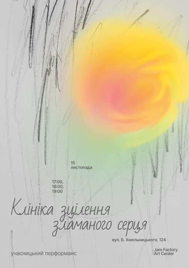 Клініка із зцілення зламаного серця – це камерний імерсивний перформанс, в якому перформерки зустрічаються із учасниками/цями та діляться саморобними способами емоційної стабілізації через історії, фізичні практики, чуттєві досвіди тощо. Перформанс побудований як нелінійна серія практик для невеликої кількості відвідувачів, що відбуваються одночасно в декількох камерних “станціях”. На відміну від медичної царини, що націлена на лікування, у клініці зцілення зламаного серця йдеться про мистецьке дослідження близькості з іншим, яке фокусується на особистих способах турботи про себе в умовах сценографічної камерності.
