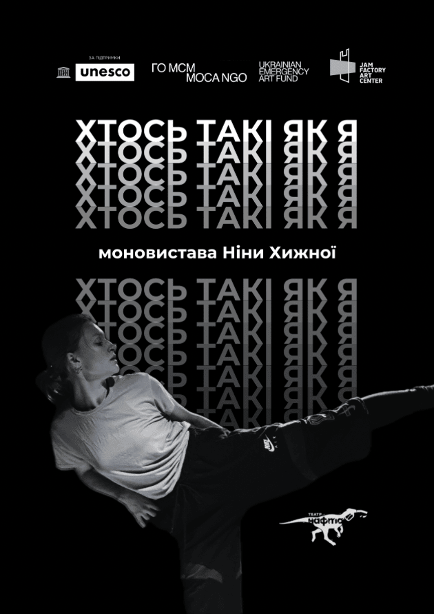 «Хтось такі як я» — перформативно-фізична моновистава Ніни Хижної про подорож безтілесної істоти тілами інших. Вона пізнає досвіди тих, хто день за днем зустрічаються зі страхом і знаходять способи йому протистояти. Через стан їхніх м’язів, через їхні рухи, звички та почуття істота пізнає досвіди людей, яким доводиться перебувати в небезпеці спричиненій війною. У фізичному стані та русі цих осіб знаходить відбиток їхній стрес, біль, смуток, нові навички боротьби і виживання, але також насолода, гумор, жага і химерне відчуття парадоксу.