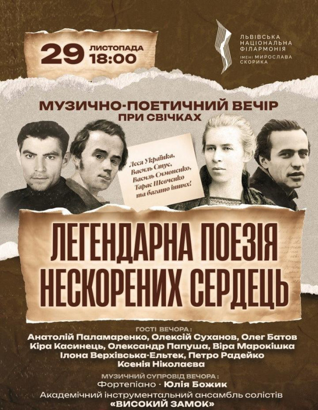 29 листопада у Львівській філармонії оживе поетичний світ українських геніїв — Тараса Шевченка, Лесі Українки, Василя Стуса, Василя Симоненка та багатьох інших, чиї слова стали молитвою, криком душі й музикою свободи.